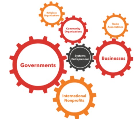 Government is not just government; government works with business, and non-profits, and community organizations. If we see these relationships, we can see the bigger system, and we can understand it all. Herein lies the secret of systems thinking and application. And of course, at the center you have the ‘systems entrepreneur!’, the driving force in systems thinking; the driving force of the paradigm shift.